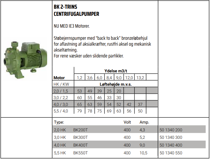 Støbejernspumper med "back to back" bronze- løbehjul for aflastning af aksialkræfter, rustfri aksel og mekanisk akseltætning. For rene væsker uden slidende partikler.